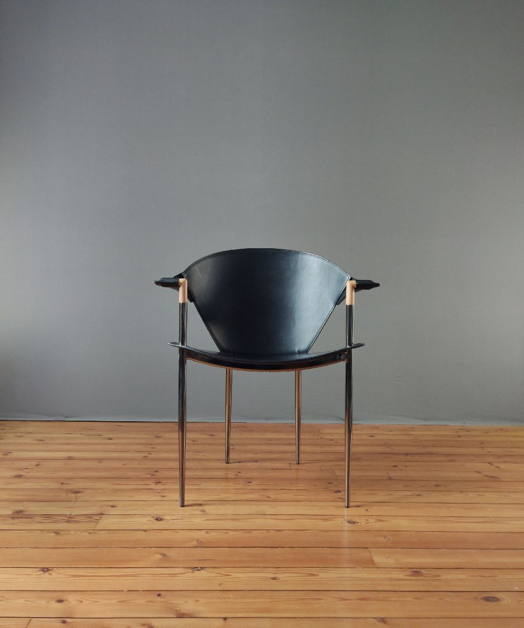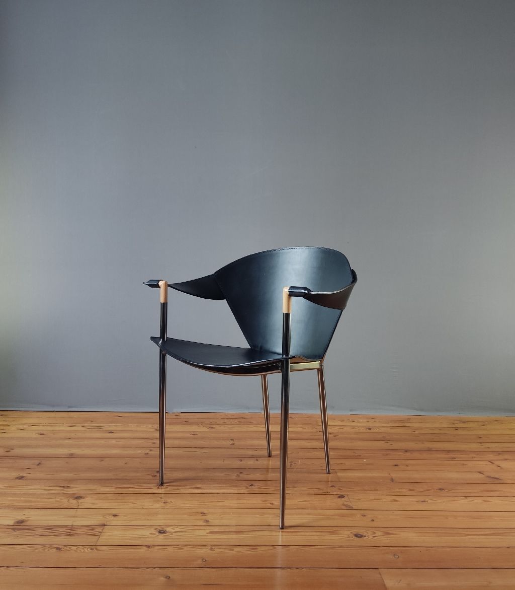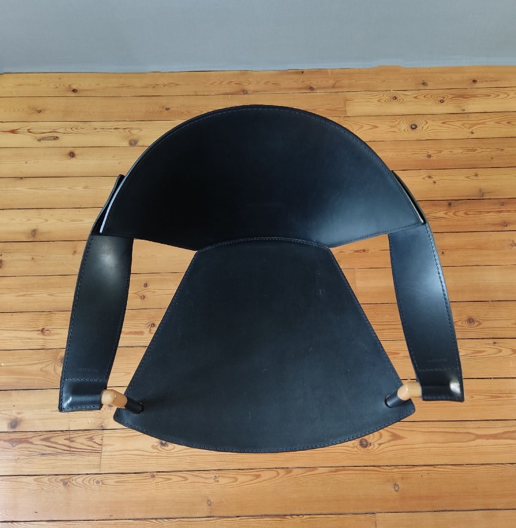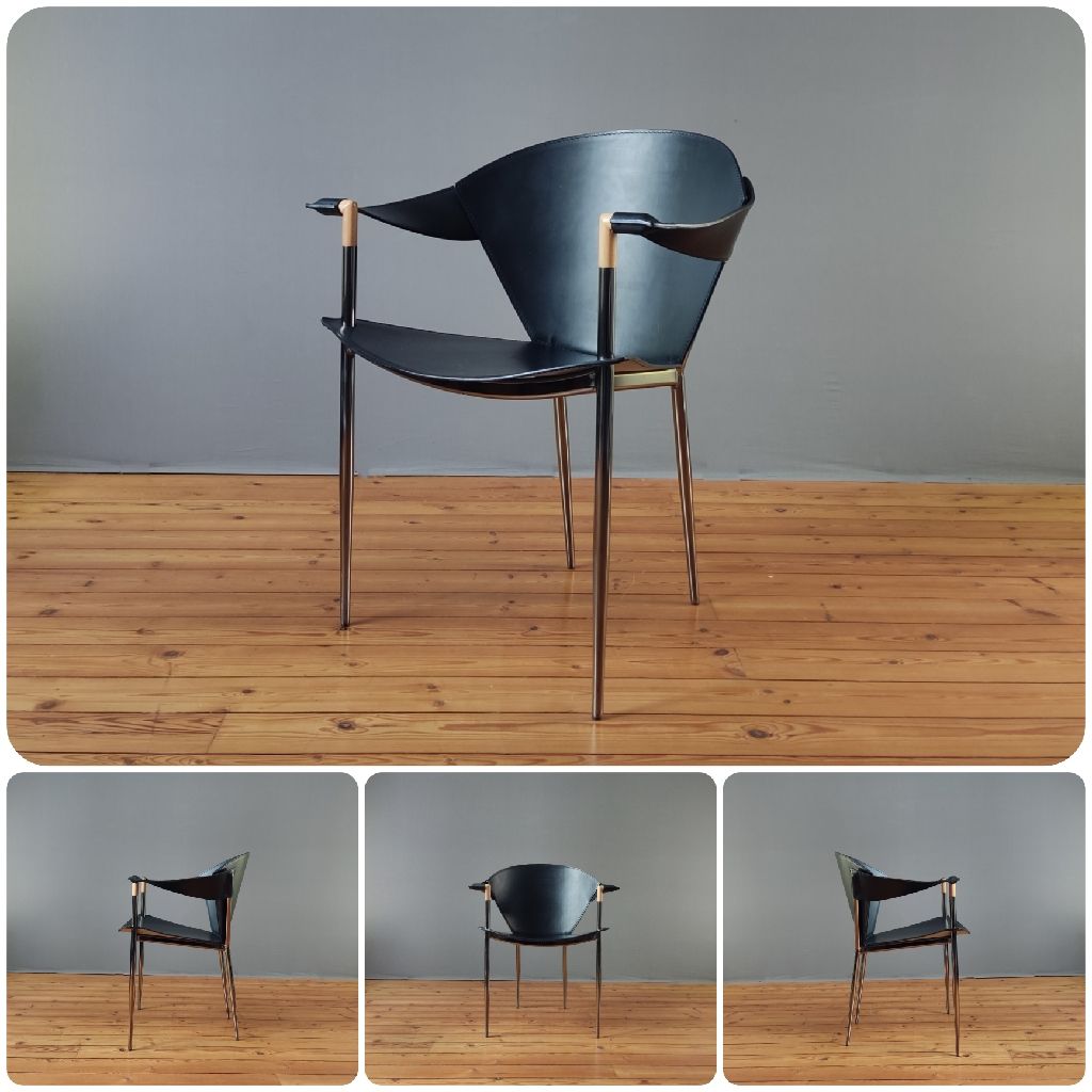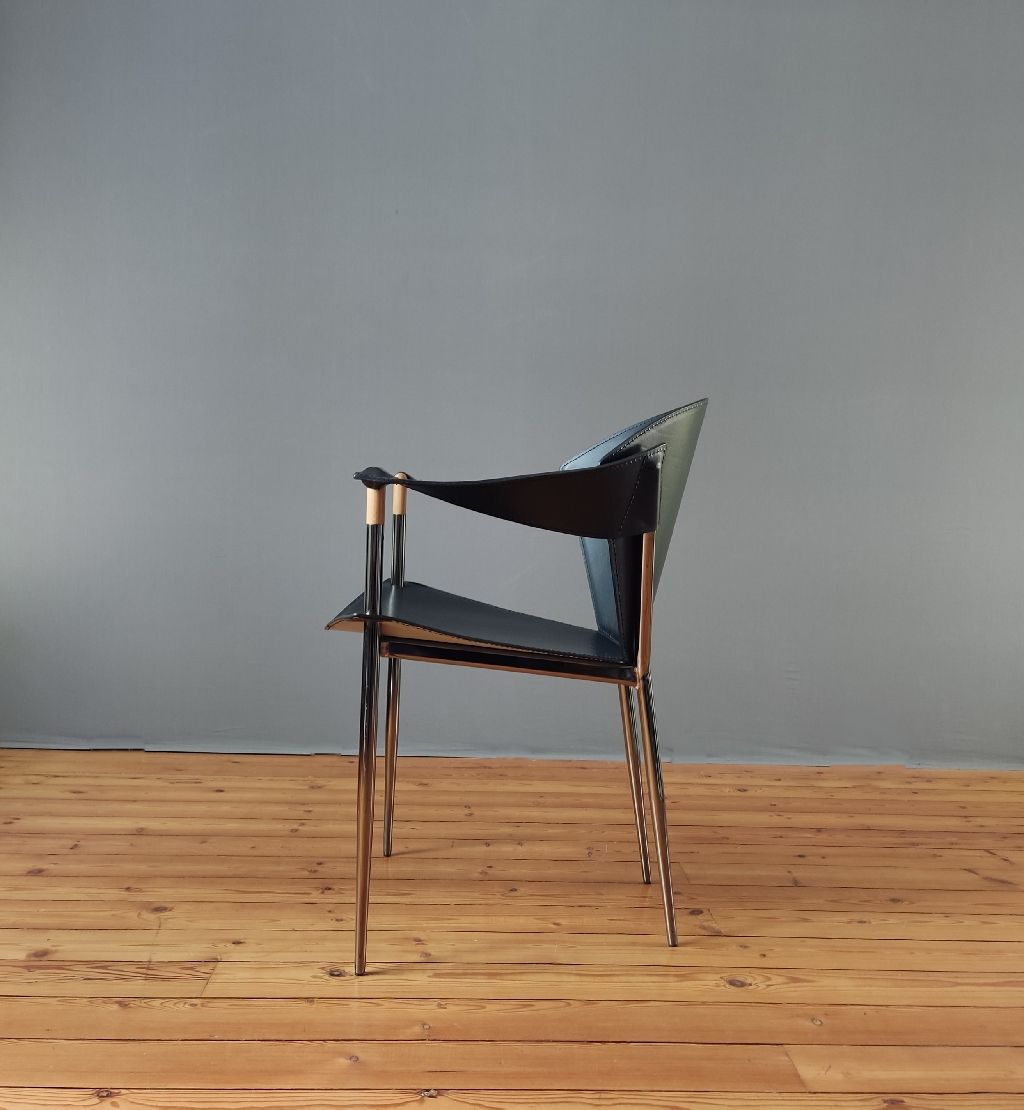 Fauteuil cuir Jocauro ARRBEN des années 1990. Ce fauteuil par ARRBEN a une structure en métal chromé noir recouverte de cuir noir. Son design postmoderne, avec son piètement fuselé métallique et son cuir, incarne la qualité de ce meuble design italien vintage. Utilisez ce fauteuil en cuir Jocauro ARRBEN comme fauteuil d’appoint, idéal pour votre salon ou bureau.