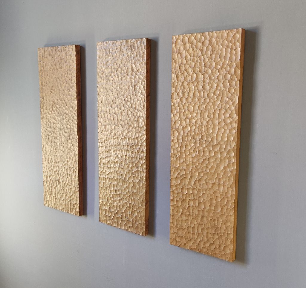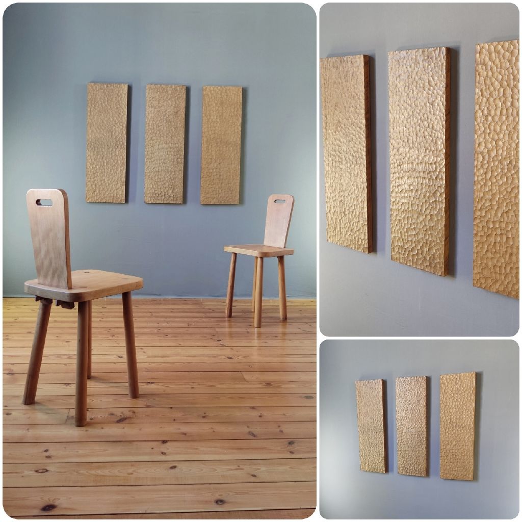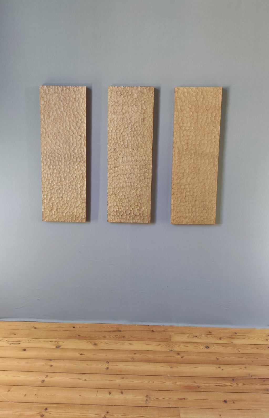 Sculpture murale « d’inspiration » de Jean TOURET, un triptyque en bois de chêne sculpté à la gouge, incarne l’art décoratif. Composée de trois panneaux en bois, cette œuvre sculpturale unique s’inspire du style déco minimaliste.