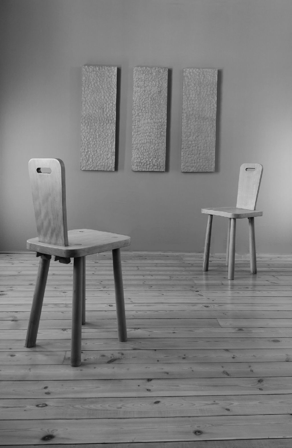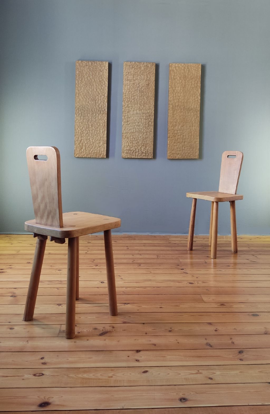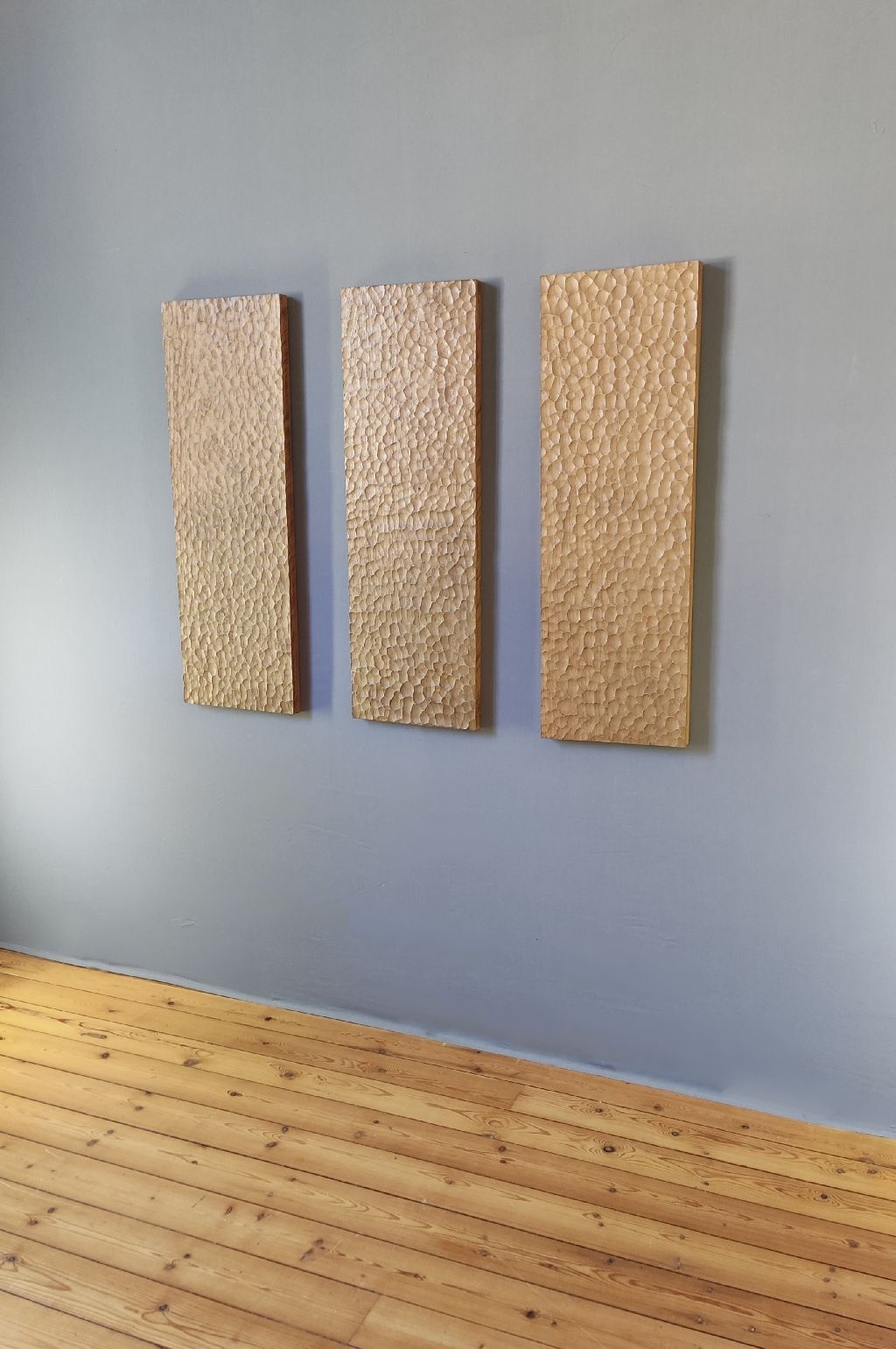 Sculpture murale « d’inspiration » de Jean TOURET, un triptyque en bois de chêne sculpté à la gouge, incarne l’art décoratif. Composée de trois panneaux en bois, cette œuvre sculpturale unique s’inspire du style déco minimaliste.