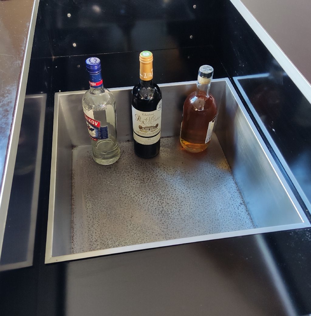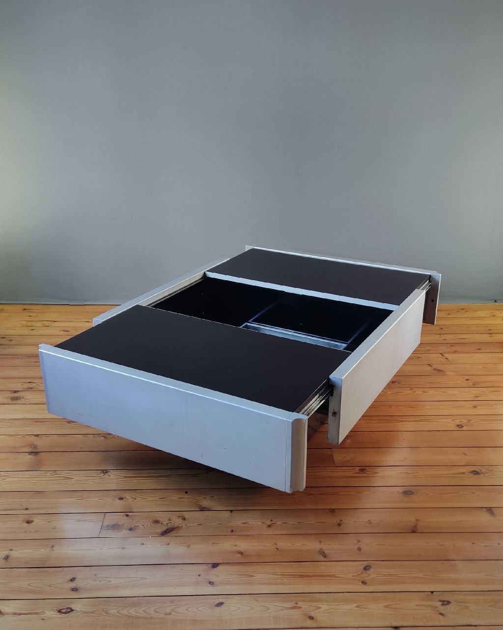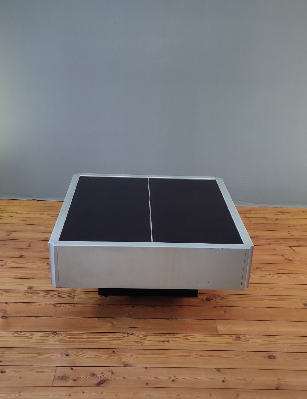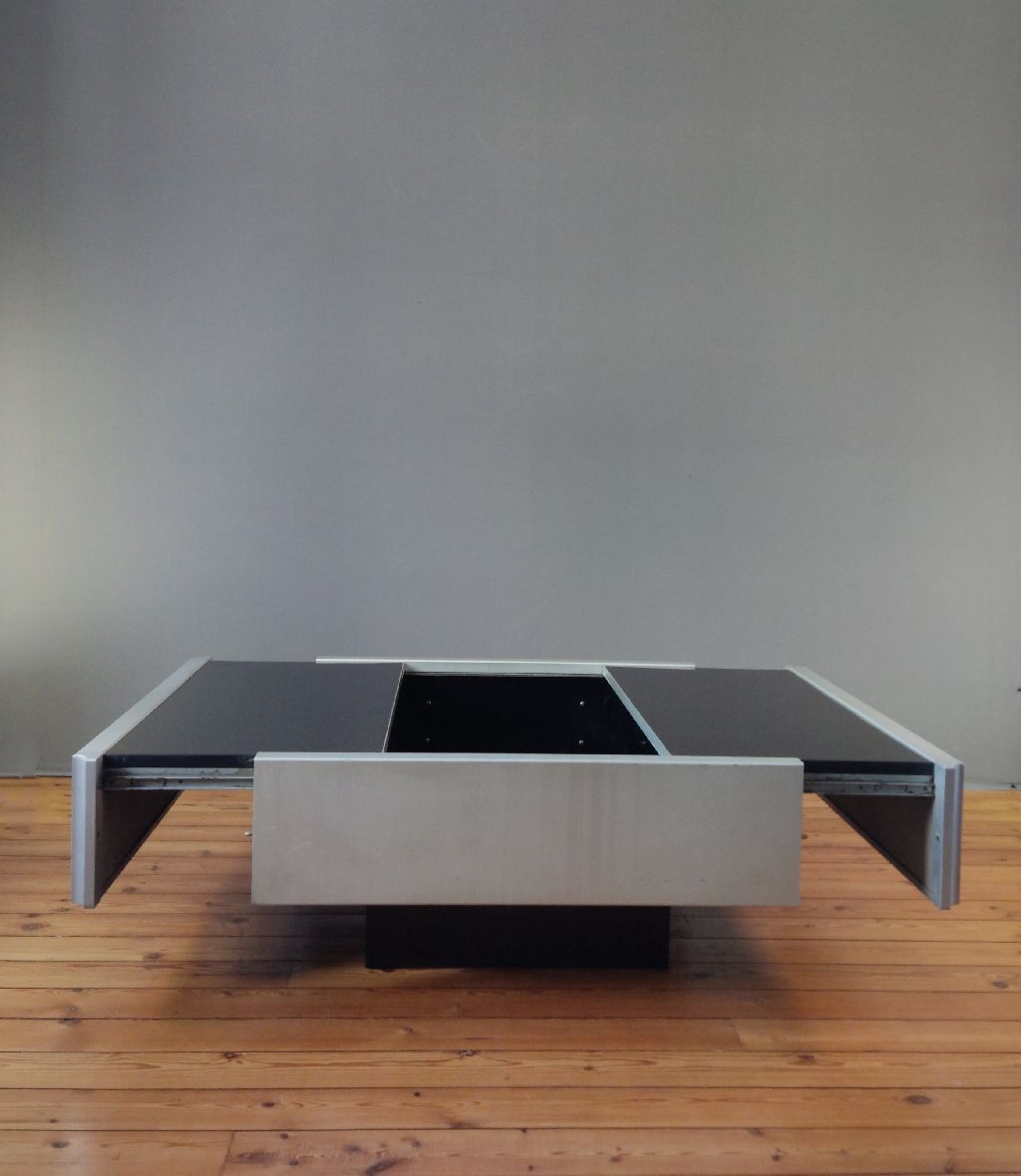 Table basse Willy RIZZO au design Space Age ou contemporain, elle s’inspire du style de Willy RIZZO. Le plateau recouvert de plexiglas noir de cette table basse s’ouvre en deux parties, révélant ainsi un bar intégré.